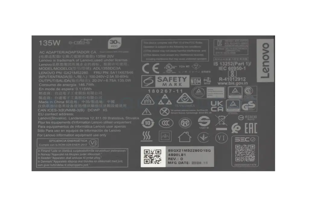 5A10W86257 original Lenovo AC-adapter 135.0 Watt slim