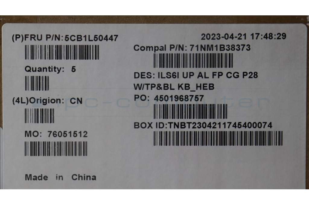 Lenovo 5CB1L50447 C-Abdeckung mit Tastatur, Hebräisch, Wolkengrau, Hintergrundbeleuchtung, Fingerabdruck