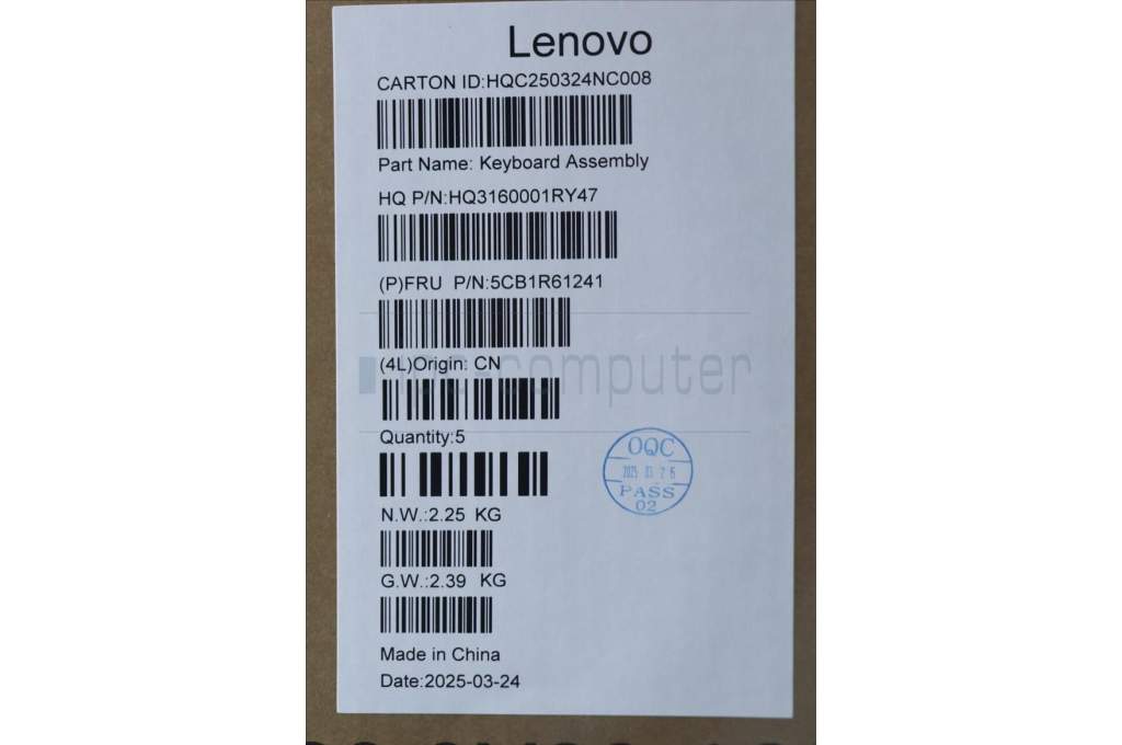 Lenovo 5CB1R61241 C-Cover with keyboard, US English Euro, Luna Grey, FingerPrint, Puresight Logo, US