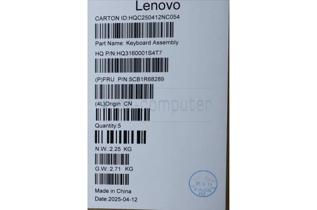 Lenovo 5CB1R68289 C-Cover with keyboard, French, Luna Grey, Puresight Logo, Non-FingerPrint, US